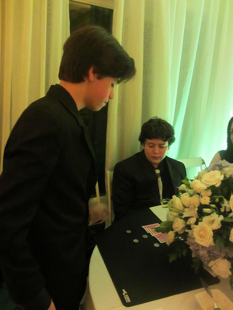 Mágica com baralhos para jovens em uma festa de formatura. Encantados, os adolescentes acompanharam com atenção os movimentos de Fernando, tentando desvendar os enigmas de cartas aparecendo e desaparecendo. A Prana promove apresentações de mágica e ilusionismo em palco ou em pequenos grupos (closeup) em festas e eventos, como forma de entretenimento.