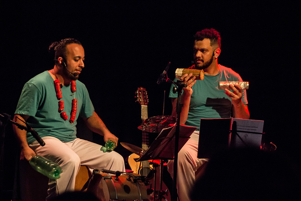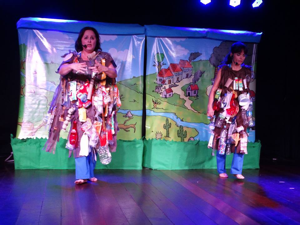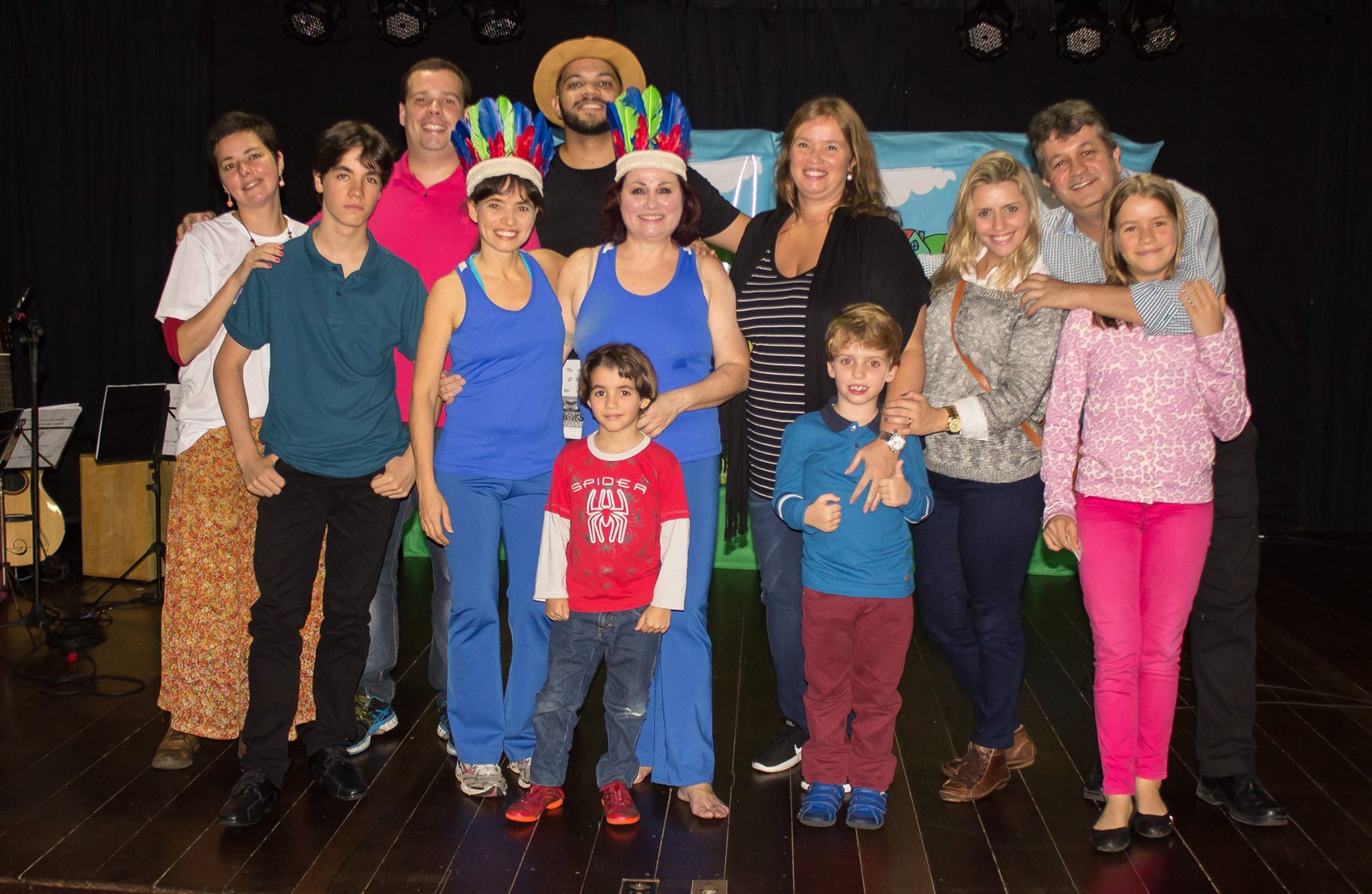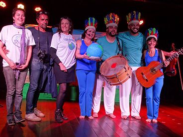 Foto tirada ao final do espetáculo, tendo, da direita para a esquerda: Valéria Wanderley, Diego Teixeira, Dino Fernandes, Monica Campos, Rosa Müller (com a camisa do projeto), Fernando Vianna e Maria de Paula Godoy (com a camisa da Prana).“As músicas e as histórias são apresentadas pelo elenco sempre de forma leve, descontraída e até engraçada, dentro do caráter lúdico e interativo do espetáculo”, explica a autora. A proposta é colocar o agressor da natureza como alvo de seus próprios atos. E, ao mesmo tempo, valorizar os preciosos recursos naturais. Em ‘Árvores’, por exemplo, são destacadas as grandiosas espécies vegetais como as rainhas da floresta.